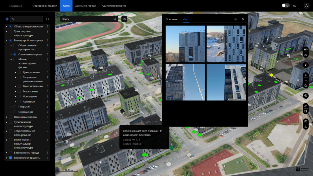 Как отметиларуководитель проектов Центра геопространственных решений Университета ИннополисКсения Краснова, такой инструмент помогает администрации городов поддерживать текущую инфраструктуру, оперативно отслеживать и реагировать на городские инциденты, а также планировать тактические и стратегические решения по развитию общественных зон, жилой застройки, транспортных узлов и других систем.